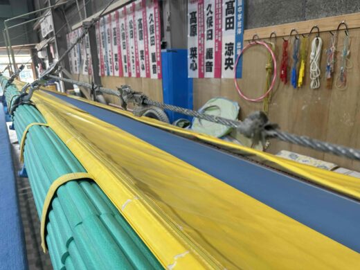 ウインチを精査したところ、ワイヤーの老朽化により素線が飛び出しており、ロングトランポリンの収納時に作業者が負傷する危険性がある状況となっておりました。